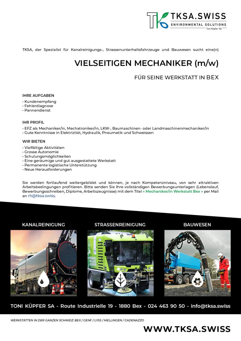 Wanted: Wir suchen für unser Atelier in Bex eine/n vielseitigen Mechaniker (m/w). Sind Sie an einer neuen Herausforderung interessiert? Senden Sie Ihren Lebenslauf und Ihr Bewerbungsschreiben an rh@tksa.swiss. job tksa DE jointheteam mechaniker rh