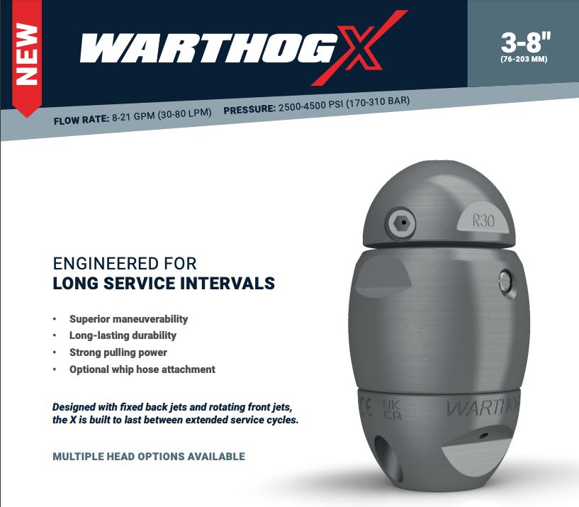 The Warthog X – Designed with X-TREME cleaning capabilities in 3-8″ lines Our NEW Warthog X is a compact powerhouse nozzle that easily maneuvers multiple bends and elbows, wyes and sweeps. The elliptical body design reduces hang-ups in offsets, fractures and settled pipe. The X handles even longer runs due to powerful back jets angled to maximize thrust and flush out debris. This nozzle boasts the longest service life of Warthog nozzles used with ½” hose. Contact your local dealer for a demo: https://bit.ly/2Rr14Sv