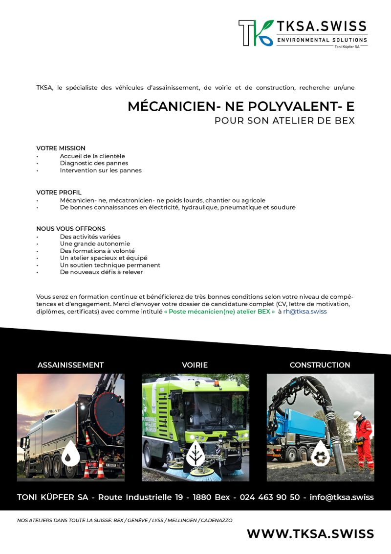 WANTED: Nous sommes à la recherche d’un/une MÉCANICIEN- NE POLYVALENT- E, pour notre atelier de Bex.
